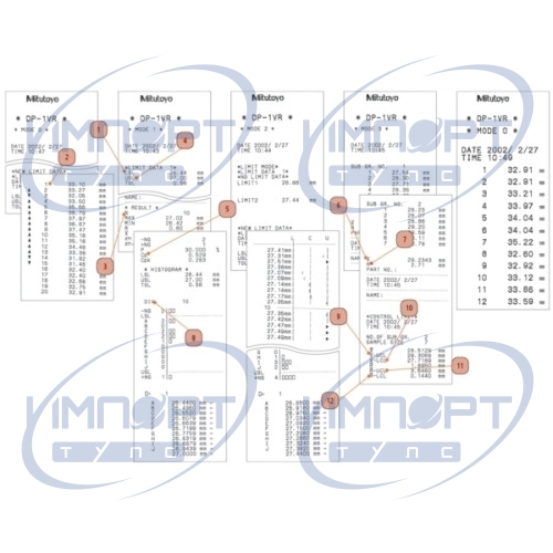 | Печатные данные | Measurement data, GO/±NO GO judgement, number of data, maximum/minimum value, range, average, standard deviation, number of defective, fraction defective, process capability, index, histogram, D-chart, control chart, generation for Xd-bar and control limit data, date and time |
